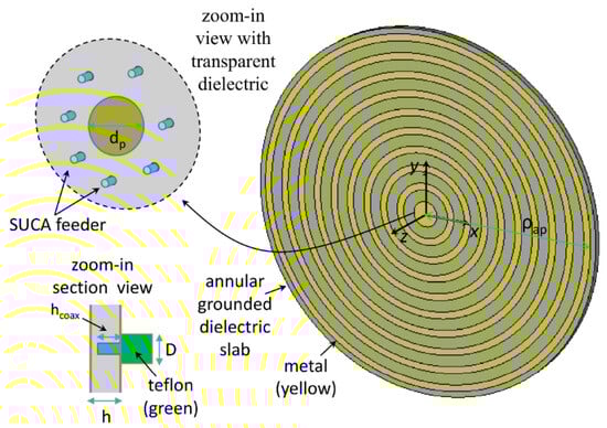 The feeding network realized through a circular array of N = 6 coaxial cables. Two concentric via-hole rings are inserted to enhance the broadband impedance matching. Reproduced from [].