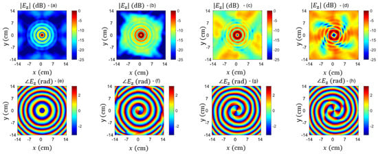 BEA fed by a circular array for the generation of twisted Bessel beams: component magnitude and phase distributions over a transverse plane for different azimuthal orders ℓ = 0, 1, 2, 3 at a frequency of 18 GHz, with . (a–d) Magnitude (dB). (e–h) Phase (rad). Reproduced from [].
