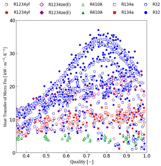 - Jige, D.; Inoue, N. Flow boiling heat transfer and pressure drop of R32 inside 2.1 mm, 2.6 mm and 3.1 mm microfin tubes. Int. J. Heat Mass Transf. 2019, 134, 566–573. [Google Scholar] [CrossRef]