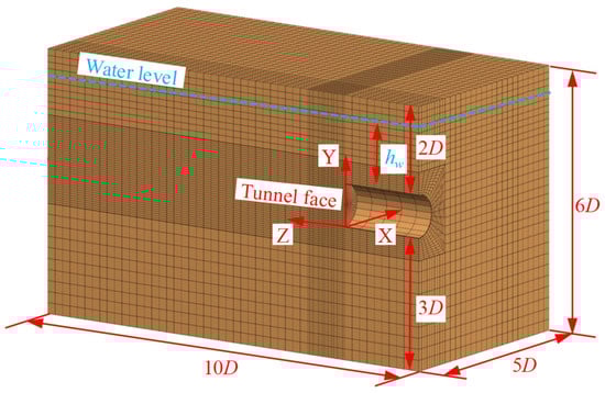 Steady-state seepage analysis was conducted using finite difference software, as shown in Figure 2. Given the homogeneous formation and circular tunnel cross-section, the three-dimensional model is horizontally symmetrical, allowing for half-model calculations. To avoid boundary effects, the model’s range was set to 5D × 6D × 10D, with a tunnel excavation length of 2D, based on relevant studies [26,27,28]. As the water level increases, the burial depth in the model also increases accordingly to ensure it remains above the water level. The element size was approximately 2 m with a refined element size of about 0.5 m in the D-length area in front of the tunnel [22]. The formation’s permeability coefficient was 10−6 m/s. Boundary conditions were set as follows: the symmetrical plane and tunnel lining were impermeable, a constant water pressure was applied to the tunnel face, and the water pressure at the water level was kept constant. Figure 3 shows the contour plot of pore water pressure distribution in the surrounding rock near the shield tunnel face when hw = 15 m.
