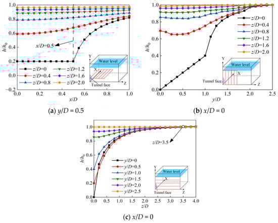 For ease of analysis, the normalized water head h/h0 is defined, and its variation near the tunnel face is plotted, as shown in Figure 4. The analysis shows that within the tunnel face range (x/D < 0.5), the water pressure variation along the tunnel cross-section direction (x-direction) is very small. Therefore, considering that the ultimate upper-bound failure mechanism only involves the front and upper local areas of the tunnel face, the variation in the x-direction can be neglected in subsequent water pressure distribution calculations. This reduces the Laplace governing equation from three dimensions to two dimensions. Further observation of the water pressure variations in the y (vertical) and z (tunnel axial) directions reveals that at 3.5D in the y-direction from the horizontal position and in the z-direction from the tunnel face, the water pressure has essentially returned to its initial state with minimal influence from seepage.