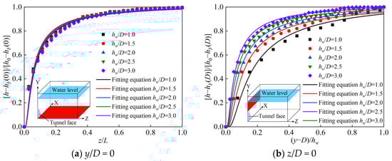 The boundary conditions f2(z), f4(z) are fitted using numerical calculation results. According to the research by Perazzelli et al. [25], an exponential function can effectively fit the seepage field distribution in front of and above the tunnel face, as shown in Equation (6). The fitting results under the conditions of this engineering case are shown in Table 1 and Figure 6.