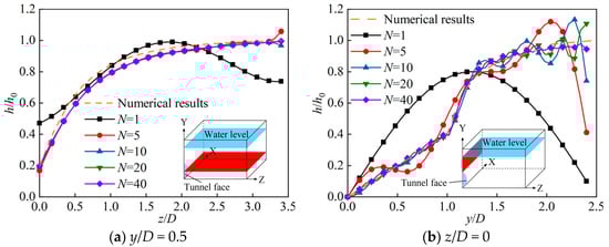 Equation (7) is an infinite series sum, but in practical calculations, the truncation term N must be considered. Figure 7 shows the calculation results for different truncation terms N. For non-boundary positions, when N = 1, the seepage head distribution curve deviates significantly; when N increases to 5, the curves are basically consistent. For boundary positions, the curve stabilizes only when N = 20; at N = 40, the curve is very stable. It is also observed that the curve corresponding to N = 40 from the analytical solution closely matches the curve obtained from numerical analysis. Therefore, in subsequent calculations, N = 40 can be used as the truncation term.