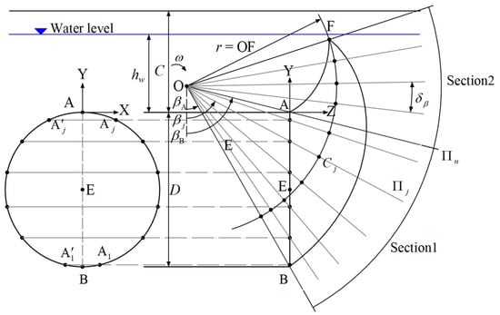 The methods for calculating head and pore water pressure have been derived in previous sections. This section focuses on using spatial discretization techniques to derive the method for calculating the ultimate support pressure of the tunnel face based on the upper bound theorem of limit analysis. Figure 9 and Figure 10 illustrate the basic principles of spatial discretization. First, the tunnel face contour is discretized into 2n points, which are denoted as Aj (j = 1, 2…, 2n). These points define the radial rotation surfaces of region 1, which are denoted as Πj (j = 1, 2…, 2n). By rotating these surfaces counterclockwise by a fixed angle δβ, the radial rotation surfaces in region 2 are determined. From the 2n discrete points on the tunnel face contour, a series of points are generated on these radial rotation surfaces through the orthogonal theorem, ultimately forming a complete failure mechanism. The specific method can be referenced from the research by Mollon et al. [18].