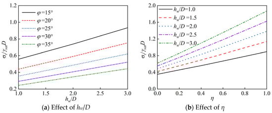 Figure 12a and Figure 12b, respectively, illustrate the variations of σt/γsatD with hw/D under different φ values and with η under different hw/D values. It can be observed that σt/γsatD shows a linear increase with increasing hw/D and η. As φ increases, the magnitude of σt/γsatD increase diminishes with increasing hw/D. Additionally, there is an interaction between hw/D and η, intensifying the increasing trend of σt/γsatD. This indicates that smaller φ values and larger hw/D and η lead to higher σt/γsatD.