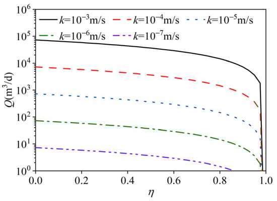 Taking hw = 15 m as an example, the influence of η on seepage at different permeability coefficients is analyzed, as detailed in Figure 15. Assuming 500 m3/d as the benchmark for controlling seepage, when the permeability coefficient is small (k ≤ 10−6 m/s), the water pressure at the tunnel face can be set to 0. However, when the permeability coefficient is large (k ≥ 10−4 m/s), the water pressure at the tunnel face needs to approach 1 to meet the seepage control requirements. Therefore, for different permeability coefficients of the strata, corresponding water pressure coefficients at the tunnel face need to be employed, which are expressed as follows: