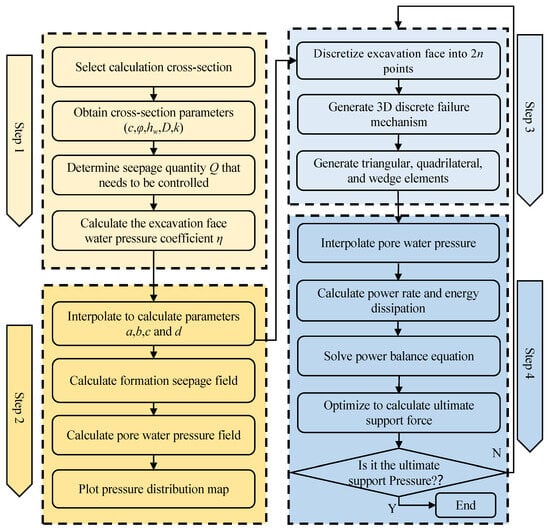 Flowchart for calculating the ultimate support pressure of tunnel face based on seepage control.