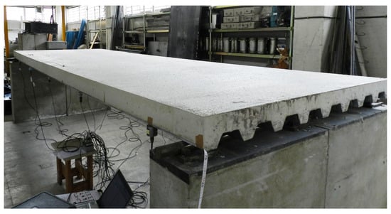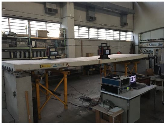 The experimental results were conducted on a full-scale laboratory structure, as depicted in Figure 2. This structure comprises a slender steel–concrete composite slab with dimensions of 5.8 m × 1.8 m × 0.14 m, resulting in a thickness-to-span ratio of only 1/40. The control of this structure was achieved using two APS electrodynamic actuators, driven by two power amplifiers (APS 144 and APS 145, APS Dynamics, Inc., Sand Diego, CA, USA). Acceleration measurements were performed utilizing a piezoelectric accelerometer (PCB Piezotronics model 393B31, PCB Piezotronics GmbH, Huckelhoven, Germany). To induce excitations and obtain the experimental frequency response functions (FRFs), a large-sledge impulse hammer (PCB model 086D50, PCB Piezotronics GmbH, Huckelhoven, Germany) was employed. This experimental setup enables comprehensive investigation and analysis of the structural response under controlled conditions, providing valuable insights into the efficacy of the proposed active vibration control strategies.