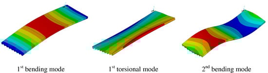 The IRC controller is tailored to minimize the peak response of the controlled system within the frequency band of 0 Hz to 15 Hz, thereby aiming to maximize damping primarily in the first two vibration modes illustrated in Figure 4. These modes hold particular significance concerning human-induced excitation and perception of vibration, as highlighted in references such as [44]. Consequently, a diagonal controller matrix of with was employed, representing a MIMO AVC system utilizing two actuators to address the primary vibration modes.
