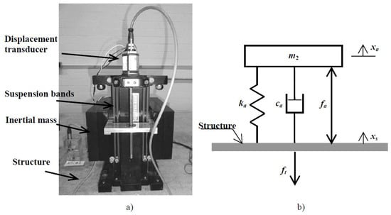 The next step is to identify the structure and actuators. The actuators used in this word were inertial mass actuators (also known as proof-mass actuators), which generate forces through the acceleration of an inertial mass on the structure on which they are placed. The actuator consists of an inertial (or moving) mass (denoted as ) attached to a current-carrying coil moving in a magnetic field created by an array of permanent magnets. The inertial mass is connected to the frame by a suspension system, modeled by a spring stiffness and a viscous damping [38] (see Figure 5).
