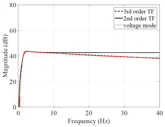 The actuator parameters identified in Equation (5)) are obtained by configuring the actuator and its amplifier to operate in voltage mode. The parameters within Equation (5)) have been meticulously tuned to align the 3rd-order transfer function with the empirical data presented in Figure 6: