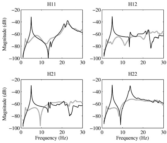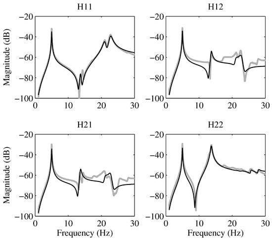 The next step is to identify the structure with the actuators. The frequency response functions (FRFs) between excitation (vertical forces), proportional to the acceleration measured in the actuator moving mass, and the structural accelerations were acquired by applying a band-limited (0.3–50 Hz) white noise signal with a duration of 600 s and utilizing a sampling frequency of 1000 Hz. Employing a subspace-based system-identification technique, an accurate model of the experimental system was obtained [43]. Consequently, the first vibration modes were identified with sufficient precision to devise a multi-input multi-output (MIMO) integral resonant control (IRC) scheme and evaluate the achievable damping in simulations. The FRFs of the measured and modeled system are presented in Figure 7, demonstrating the effectiveness of the system-identification process in capturing the dynamic behavior of the structure. These FRFs serve as crucial benchmarks for validating the proposed MIMO IRC control scheme and assessing its performance in mitigating vibrations across the targeted frequency range.