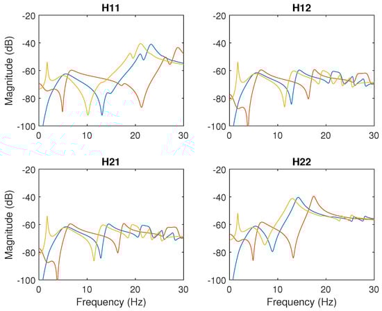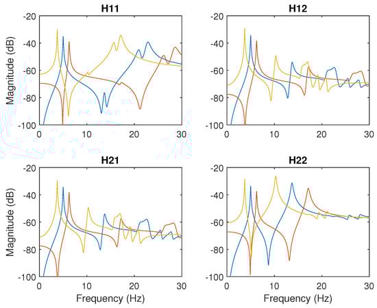 Firstly, note that the stability condition of the controller optimization is that all the eigenvalues of the state matrix of Figure 1 must be positive. The real part of the closest pole to the imaginary axis is −1.63, which indicates that the system is stable. Secondly, the natural frequencies of the structure were considered variables with an error of ±25%. Figure 8 shows the plot of the identified model (blue) and the system with a variation of +25% (yellow) and of −25% (red).