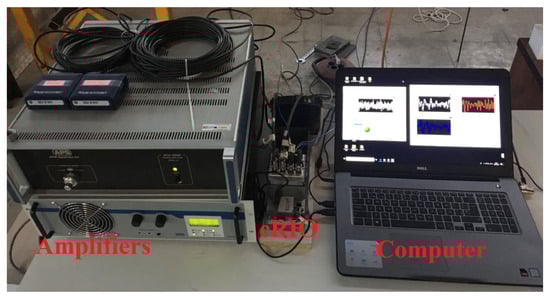 The controls were carried out using the LabVIEW Real-Time Module, National Instrument, Austin, TX, USA and the NI acquisition system cRIO-9066, National Instrument, Austin, TX, USA equipped with the analog output card NI-9203 and the IEPE conditioning cards NI-9234 to measure the structure response. It is important to highlight that saturation blocks are included to reduce stroke and force saturation risks. In Figure 10, the cRIO, amplifiers, and a computer recording the results coming from the second loop of the block diagram can be seen.