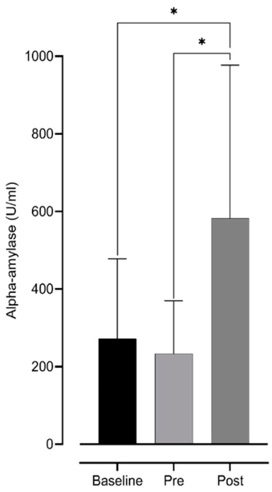 Alpha-amylase differences. Legend: *—statistically significant difference.