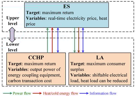 The agents in the CIES can be divided into two layers, as shown in Figure 1. The upper-level entity is the ES, the optimization objective is maximizing revenue, and the output is real-time energy prices. The lower-level entities include CCHP and the LA. The optimization goal of CCHP is to maximize revenue by outputting energy, such as power and heat, while also generating carbon emissions and carbon trading fees. As an energy-consuming group, the LA’s optimization goal is to maximize consumer surplus, with variables including movable power load and reducible heat and gas load.