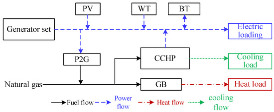 The CCHP system combines new energy power generation with traditional fossil fuel power generation to optimize the operation status of each piece of equipment and meet users’ needs for different energy sources at different times. The structure diagram is shown in Figure 2. In this paper, new energy includes wind turbine (WT), photovoltaic (PV), and battery (BT), and it adopts the principle of maximizing consumption. The controllable unit includes an internal combustion generator (ICG), gas boiler (GB), and power-to-gas (P2G) facilities.