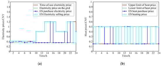 ES optimal scheduling results. (a) Electricity price curve at each moment. (b) Heat price curve at each moment.