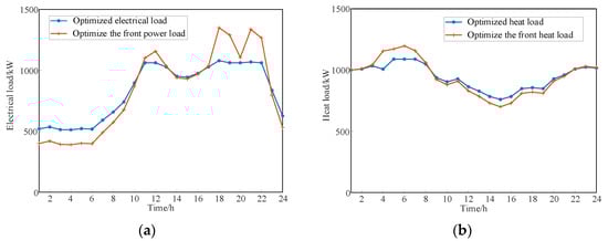 Load aggregator optimization scheduling results. (a) Power load curve before and after the demand response. (b) Heat load curve before and after the demand response.