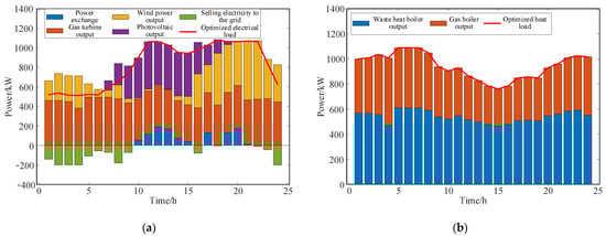 Optimization scheduling results of new energy CCHP system. (a) Power equipment optimization scheduling results. (b) Heat equipment optimization scheduling results.
