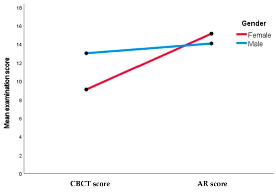 A mixed-model ANOVA was conducted to examine differences in CBCT and AR scores between male and female participants. The test type (CBCT vs. AR) was included as a within-subjects factor, and gender was included as a between-subjects factor. A significant main effect of test type, F (1,41) = 39.72, p < 0.001, indicates an overall difference in scores between CBCT and AR. A significant interaction between test type and gender was found, F (1,41) = 19.60, p < 0.001, suggesting that the difference between CBCT and AR scores varied by gender. Female participants exhibited significantly higher AR scores (M = 15.12, SD = 2.71) compared to CBCT scores (M = 9.08, SD = 2.80), t (41) = 8.42, p < 0.001, with a mean difference of 6.04 units (95% CI [4.57, 7.51]). While male participants also showed higher AR scores (M = 14.06, SD = 2.29) compared to CBCT scores (M = 13.00, SD = 4.13), this difference was not statistically significant, t (41) = 1.18, p = 0.226. There was no significant main effect of gender on overall test scores, F (1,41) = 3.71, p = 0.061, indicating no overall difference in mean scores between males and females (Figure 4).