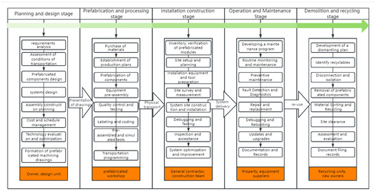 It is crucial to clarify the implementation process of each stage, and the only way to find the keywords for future development is to detail the specific implementation process so that this section will study each stage of the whole life cycle in detail. The overall lifecycle workflow of the assembled electromechanical system begins with the owner and the design unit analyzing and completing the drawing design [8] and the prefabrication plant carrying out the drawing submission. The prefabrication plant prefabricates the components [12] and then transports them to the site for installation by on-site construction crews [13]; the system is delivered by the construction crews to the property owner and the equipment supplier for operation and maintenance [6], and finally recycled by the recycling unit and the new owner [11], as shown in Figure 3.