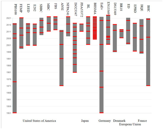 The assembled houses in western developed countries have developed to a relatively mature and perfect stage. The United States, Japan, Germany, France, Denmark, and the European Union are the most typical countries and regions. This chapter summarizes the policies and analyzes their national policies to assist China’s assembly development. Assembly has been popularized in the United States since the 1970s, so it is necessary to study it. Its NFPA241 [14] stipulates the standards during construction, remodeling, or demolition. GSA (P100) has made mandatory requirements for design standards and performance standards [15], FEMP [16], and FBS [17]. ISO 23347 [18] has requirements for factory automation and energy. In addition, the U.S. Green Building Council [19], the American Institute of Architects [20], the American Institute of Steel Construction Release [21], the Modular Building Institute [22], and the American National Standards Institute [23] all provide instructions for structure, energy, and developing details. Japan’s JIS [24] has also made strict regulations on precast concrete, and BL [25] has made certification standards and evaluation criteria for components. Germany’s EnEv [26] has further requirements for energy-saving in buildings, and DIN EN 13369 [27] has standardized precast concrete component products. France’s HQE [28], NF EN 13369 [29], and Denmark’s BR18 [30] provide requirements for building permits, and DS/EN 13369 [31] provide specifications, essential performance criteria, and performance stability. The European Union’s ED [32] and EPBD [33] have also contributed to its development. The red line in the figure represents when the policy was updated (see Figure 4). The abbreviated policy names are elaborated in the following figure (see Table 1).