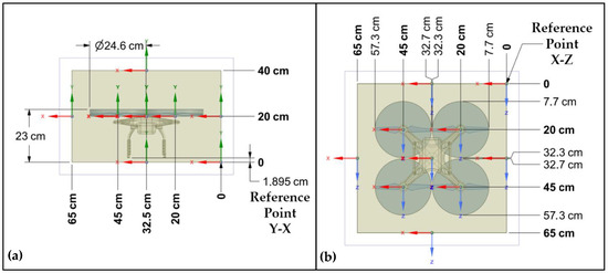 A specific reference point was defined in the fluid model of the UAV. The relative positions of the UAV with respect to this reference point are illustrated in Figure 1. In the CFD geometry used for multiple flight analyses, the positionings were defined relative to this specified reference point. According to this reference point, the distances along the Y-X and X-Z axes are shown as local coordinates.