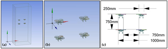 CFD geometries: (a) external fluid volume with quadrotors; (b) swarm formation; (c) distances of UAVs.