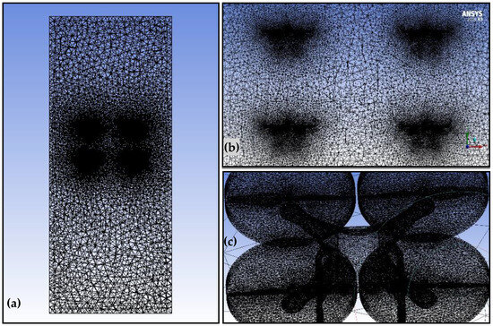Figure 3 illustrates the mesh of the CFD geometry. ANSYS-Mesh (v19) software was used for mesh generation purposes. Figure 3a shows a cross-sectional view of the CFD geometry, Figure 3b displays the arrangement of UAVs, and Figure 3c illustrates the meshes of the four-rotor model.