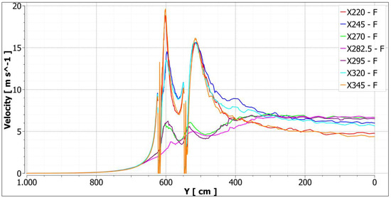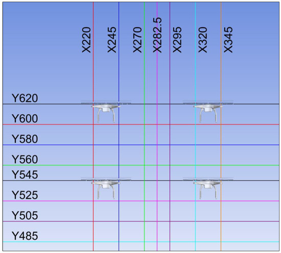 Velocity distributions on vertical data lines are shown in Figure 9. Data were collected along vertical lines ranging from X220 to X345. The values X220, X245, X320, and X345 represent the vertical lines taken from the propeller axes, while X270, X282.5 (midpoint), and X295 are used to determine the vertical lines between the UAVs. The velocity plot obtained along these vertical lines is illustrated in Figure 9. The values of Y at 620 cm and 545 cm correspond to the rotating-axis origin of the propellers.