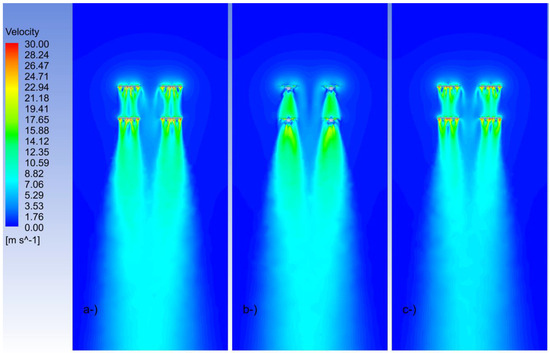Figure 5 depicts the contours of velocity distributions in planes defined by the front and rear propeller axes as well as the midpoint of the UAVs. Figure 5a represents the contours from the rear propeller plane, Figure 5b from the midplane of the UAVs, and Figure 5c from the front propeller plane. In the velocity distribution, UAVs positioned below were affected by the airflow generated by the UAVs positioned above. When examining the velocity contours, it has been determined that velocity distributions approximately 2.5–3 m below the UAVs exhibited homogeneity along the propeller axes and vertical axes taken between the UAVs. Velocity distributions are shown by taken over the horizontal lines in Figure 8 and taken over the vertical lines in Figure 9. It has been observed that a phenomenon similar to the “Near-field mixing phenomenon”, which occurs in near-jet flows, manifests in the airflow produced by the UAVs [22]. This study introduces a new phenomenon named the “Near-UAV Phenomenon” resulting from the investigation of close UAV effects.