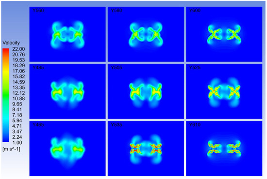 When examining the Y600 and Y525 vertical planes, it is clearly observed that the velocity distribution increased after the vehicles positioned below. The formation of vortices was observed between the UAVs at Y610, Y600, and Y580 vertical planes. In the Y560 contour, the outward flow generated by the propellers of the UAVs positioned above was affected by the flow generated by the UAVs positioned below, resulting in distribution up to Y505 while passing near the vehicles. This distribution is visually represented with streamlines in Figure 7.