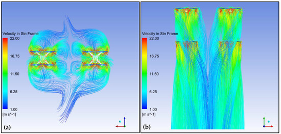 The streamlines generated by the UAVs are illustrated in Figure 7, where Figure 7a shows the top view and Figure 7b shows the front view. By following the paths of the streamlines and the resulting trajectories, the flows around the vehicles were determined, and the velocities along the streamlines were also shown. The turbulence occurring between the UAVs was visualized. Additionally, it was observed that the flow generated by the outer propellers of the UAVs positioned above passed through between the vehicles.