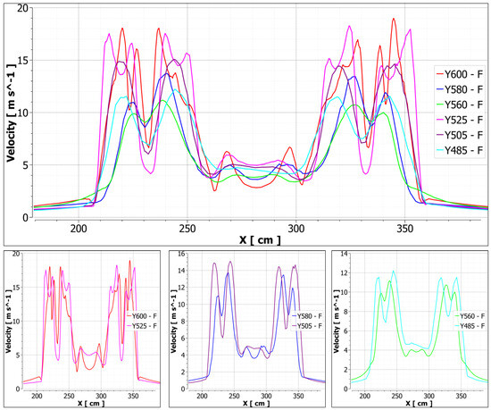 Examining the graph of data obtained from vertical lines indicates that the velocity under the upper vehicles at Y = 600 cm reaches approximately 19 m/s on the X220 and X345 lines, while it is up to about 14 m/s on the X245 and X320 lines. On the X220, X245, X320, and X345 axis lines, this velocity under the lower vehicles is approximately 15 m/s at Y = 525 cm, while it reaches its highest value around Y = 515 cm, reaching approximately 15.5 m/s.