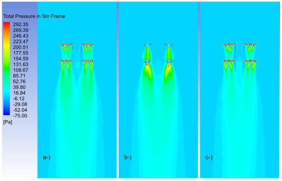 Figure 10 illustrates the total pressure contours taken from the front and rear propeller planes, as well as the mid-plane of the UAVs. Figure 10a illustrates the contours taken from the rear plane, Figure 10b shows the contours from the mid-plane, and Figure 10c displays the contours from the front plane in a comparative manner. Upon detailed examination of these contours, it is evident that low-pressure regions formed in the middle of the UAVs. Approximately −50 Pa pressure is observed on the opposing propeller surfaces of the UAVs positioned at the top. While it can be anticipated that the UAVs positioned above could affect those below, it has also been determined that they are affected by the airflow generated as they approach each other horizontally. The total pressure lines resulting from the interaction of near-UAVs are presented both horizontally and vertically in Figure 11 and Figure 12. The total pressure below 2.5 m from the UAVs is approximately 40 Pa.