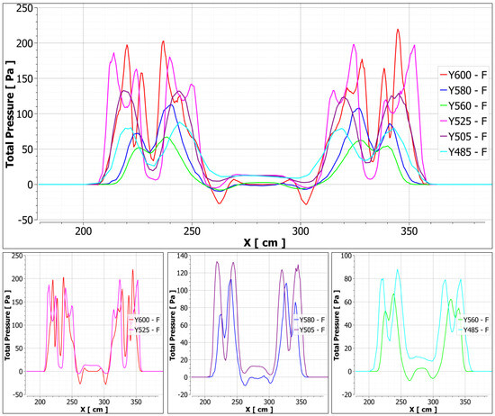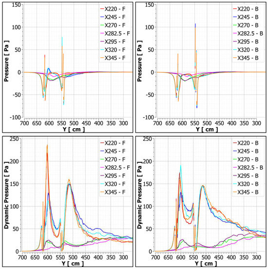 Dynamic and static pressure values are also illustrated in Figure 13. The pressure and dynamic pressure plots taken from the front and rear axis planes are comparatively presented. The planes representing the front are denoted as “F”, whereas those representing the rear are denoted as “B”. The Y-axis range in these graphs is taken between 700 cm and 300 cm.