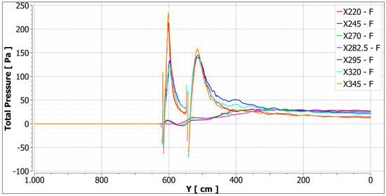 The total pressure plot derived from vertical data lines is displayed in Figure 12. These vertical data lines are taken from a range of X220 to X345. Between Y 620 cm and 600 cm, the total pressure is increased at the UAVs positioned above. Y = 600 cm, the pressure reaches approximately 210 Pa on the X220 and X345 lines, while it is around 125 Pa on the X245 and X320 lines. It remains below 100 Pa at Y = 580 cm and is around 40 Pa at Y = 560 cm. Subsequent to the UAVs positioned below, the pressure is measured at 120 Pa at Y = 525 cm and reaches around 145 Pa near Y = 515 cm. The pressure between the axis lines ranges between 30 and 40 Pa at Y = 300 cm.