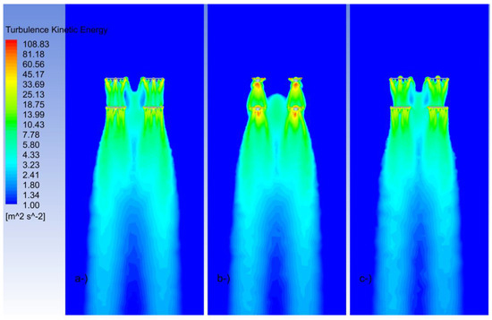 The turbulence kinetic energy (TKE) contours generated from three distinct planes are shown in Figure 14. The contours obtained from the rear plane are shown in Figure 14a, those from the mid-plane in Figure 14b, and those from the front plane in Figure 14c. A discernible increase in turbulence kinetic energy is observed amidst the UAVs. Upon close examination of the contours derived from the mid-plane, it is observed that the TKE can reach up to approximately 80 m2/s2 in proximity to the UAV fuselages. The TKE values obtained over horizontal and vertical lines are presented in Figure 15 and Figure 16, respectively. Notably, the peak levels of TKE are observed under the UAV body due to the flow dynamics developing under the propellers.