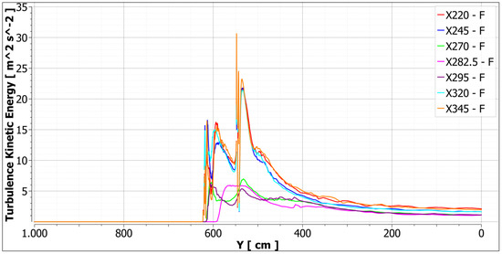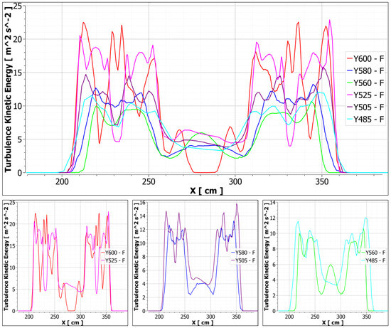 The distribution of turbulence kinetic energy (TKE) over horizontal lines is illustrated in Figure 15. The lines Y600-Y525, Y580-Y505, and Y560-Y485 are positioned 20, 40, and 60 cm below the rotation centers of the propellers, respectively. The X positions of the propeller centers are at 220, 245, 320, and 345 cm. In these regions, the TKE reaches a maximum of 23 m2/s2. Also, TKE values are increased closer to the propeller tips of the UAVs.