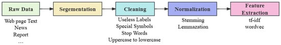 Data cleaning is the primary step in data preprocessing, aiming to remove noise, eliminate duplicate content, handle missing values, and standardize data formats. In text data, noise refers to irrelevant information and useless characters that can interfere with the model’s training process. Methods for removing noise include deleting HTML tags, removing special characters, and non-text information. Duplicate content can cause the model to overfit specific patterns, reducing its generalization ability. To eliminate duplicate content, text comparison algorithms are used to calculate the similarity between texts and identify and delete duplicates. Suppose there are two text segments and , their similarity can be calculated, and a threshold can be set to determine whether to delete them: