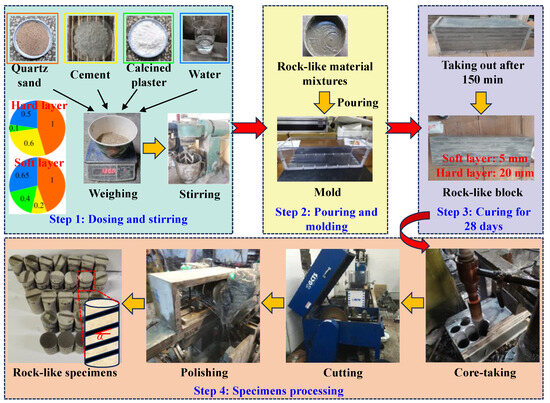 The preparation process of specimens is depicted in Figure 1. Rock-like materials are measured and mixed in specific proportions, with ink added to the soft layer material to distinguish it from the hard rock. The mixture is then poured layer by layer alternately into molds, with approximately 120 min between adjacent layers to ensure proper solidification of the mixture. After pouring, once the synthetic rock blocks reach a certain strength, they are removed for curing. After the rock-like blocks have cured to a certain strength, a core drill with a diameter of 50 mm is used to drill samples from the blocks at five angles (0°, 30°, 45°, 60°, and 90°) in a clockwise direction. Three samples are prepared for each angle. Finally, following the testing methods recommended by the International Society for Rock Mechanics, the drilled cores are cut and polished into standard cylindrical rock specimens with a diameter of 50 mm and a height of 100 mm [25]. The processed specimens are categorized and numbered accordingly, using “S-α” to denote each specimen. In this notation, “S” represents specimen, and “α” denotes bedding angle. For example, S-45 indicates the soft–hard interbedded rock-like (SHIR) specimen with a bedding angle of 45°.