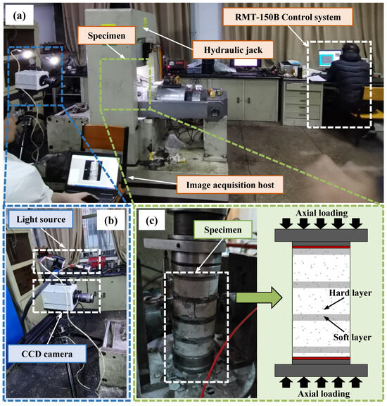 The RMT-150B rock mechanics loading system from the Wuhan Institute of Rock and Soil Mechanics, Chinese Academy of Sciences, was utilized in this study (as shown in Figure 2). This loading system is characterized by a vertical hydraulic jack with a maximum output force of 1000 kN and a maximum compression deformation of 50 mm. The control system allows real-time acquisition of the relationship between force and displacement during rock loading. In addition to the loading system, the experimental system includes a CCD camera, light source, and image acquisition host. The CCD camera captures real-time images during the rock loading process, recording the fracture process of the rock. For axial loading in this experiment, the displacement control of 0.005 mm/s is adopted. Prior to testing, a CCD camera is fixed on one side of the rock specimen, capturing images at a rate of 1 frame per second (fps) during specimen loading, with an image resolution set at 1024 pixels × 1024 pixels. This experiment involves three groups totaling 15 specimens for uniaxial compression tests. Each group includes five varying α (0°, 30°, 45°, 60°, and 90°). To minimize data dispersion and avoid excessive repetition in analysis, specimens with compressive strength values closest to the mean are selected for detailed analysis based on each α.