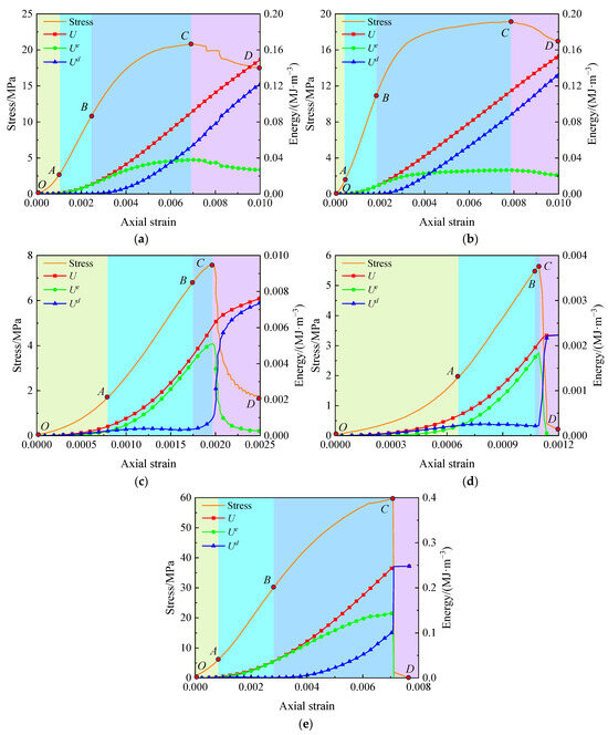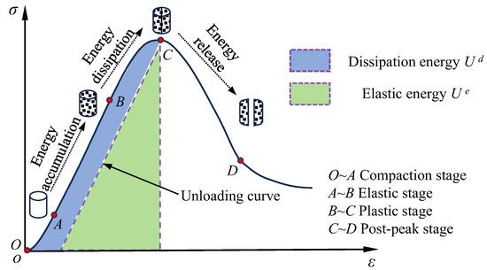 During the process of deformation and failure, rocks continuously exchange energy with their surroundings. Energy conversion mainly involves four stages: energy input, energy accumulation, energy dissipation, and energy release [14]. During the compaction stage, part of the externally input energy accumulates in the rock as Ue, while another part is consumed by the closure of original microcracks and microfissures. In the elastic stage, Ue stored in the rock continues to increase. In the plastic stage, cracks begin to initiate and propagate; the proportion of Ue decreases gradually, and Ud begins to increase. In the post-peak stage, cracks further propagate and interconnect, resulting in macroscopic rock failure, and most of the previously stored Ue is released. The formulas for calculating the various strain energies are as follows [28]: