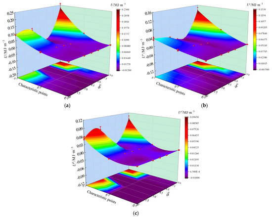 U, Ue and Ud of SHIR specimens with different α at the characteristic points: (a) U; (b) Ue; (c) Ud.