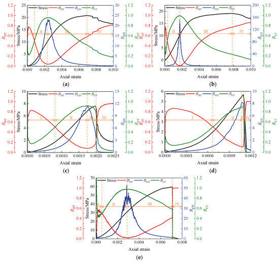 RDT, RET, and RED curves of SHIR specimens with different α: (a) S-0; (b) S-30; (c) S-45; (d) S-60; (e) S-90.