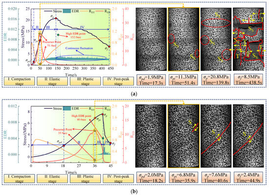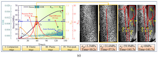 Figure 7a shows the EDR and energy ratio (RDT and RED) curve variations of specimen S-0 and the process of surface crack propagation. In Section 3.4, the energy ratio curves of specimens with different α have been analyzed in detail, so it will not be repeated here. At Stage I, the energy dissipation in the rock is minimal. The EDR fluctuates near zero with a low amplitude, and there are essentially no visible cracks on the surface of the rock. With increasing load, entering Stage II, the amplitude distribution of EDR remains mostly unchanged, and the rock undergoes slight deformation, characterized by minor surface spalling near the bedding planes of the rock. When the stress reaches σpi (11.3 MPa), the amplitude of EDR gradually increases and remains at a high level, indicating continuous generation and expansion of internal cracks within the rock. When the stress reaches σp (20.8 MPa), the distribution range of surface cracks (SS cracks) on the rock expands further. Subsequently, as the stress begins to decrease, there is a sudden increase in the amplitude of EDR at 152.0 s, resulting in a significant positive value. This reflects the intensification of damage and fracture in the rock, leading to severe destruction of its original structure. Subsequently, EDR continues to fluctuate continuously, with cracks continuously expanding and intersecting with each other, ultimately leading to complete instability and failure. As the stress decreases to σf (8.5 MPa), the rock exhibits numerous surface spalling cracks and tensile fractures.