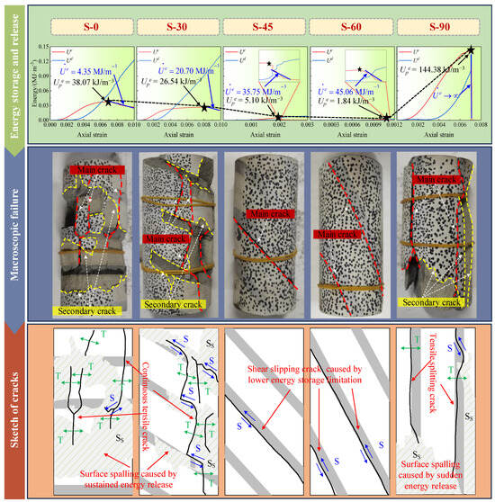 The more energy storage before the peak, the greater the energy release during the post-peak, and the characteristics of energy release are directly related to the macroscopic failure of the rocks. Therefore, there is an inherent connection between energy storage, release, and macroscopic failure of rocks [38]. Variations in strength and energy characteristics of SHIR specimens with different α under uniaxial compression lead to different macroscopic failure modes. In this experiment, rocks with α = 45°~60° require the least strength and energy for failure, characterized by shear sliding along bedding planes. Rocks with α = 0°~30° primarily fail through tensile failure of the rock matrix, requiring higher strength and energy. Although the macroscopic failure mode of rock with α = 90° is characterized by tensile splitting failure along bedding planes, it can be seen from Figure 7c that before the stress of specimen S-90 reaches the yield stress during the loading process, the tensile crack has begun to produce and expand along the bedding plane, with the accumulation of elastic energy driving deformation and failure of the rock matrix. Furthermore, the greater the elastic energy accumulated before the peak stress, the larger the energy released during rock instability failure, leading to the formation of more cracks that interconnect to form surface spalling areas, providing additional release paths. Specimens S-0 and S-30 exhibit ductile failure with high energy storage limitations and lower rates of elastic energy release, characterized by stable energy release in the post-peak stage. Specimen S-0 shows extensive surface spalling in both soft and hard rock matrices, while specimen S-30 exhibits relatively less surface spalling, mostly in the soft rock matrix. Specimens S-45 and S-60 have lower energy storage limitations and show minimal surface spalling, whereas specimen S-90 exhibits the most severe surface spalling, and the rock failure is brittle. Upon reaching peak stress, the elastic energy stored prior to failure in specimen S-90 is instantaneously released, resulting in a nearly infinite rate of elastic energy release and extensive detachment of rock matrix blocks.