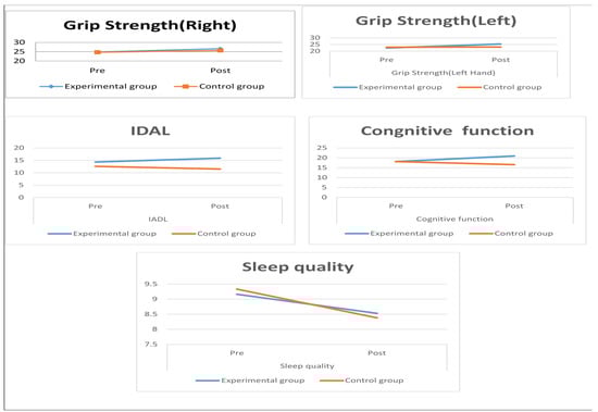 No adverse events were reported during the intervention period. Our results revealed that HGS significantly increased in both the right hand (paired t = −1.252, p < 0.001) and left hand (paired t = −1.225, p < 0.001) in the experimental group after the intervention compared with before the intervention. In terms of IADLs, the experimental group exhibited significant improvements in their abilities to shop (paired t = −3.50, p = 0.002), participate in outdoor activities (paired t = −2.68, p = 0.012), and manage medications (paired t = −4.35, p = 0.001) after the intervention compared with before the intervention. Furthermore, regarding cognitive function, the experimental group exhibited significant improvements in attention (paired t = −7.84, p < 0.001), calculation ability (paired t = −1.42, p < 0.001), and memory (paired t = −5.30, p < 0.001) after the intervention compared with before the intervention. Finally, regarding sleep quality, the experimental group exhibited significant improvements in sleep latency (paired t = 2.68, p = 0.012) and sleep duration (paired t = 4.06, p = 0.001) after the intervention compared with before the intervention. By contrast, no significant differences in physical or cognitive function or sleep quality were noted in the control group after the intervention compared with before the intervention (Table 2).