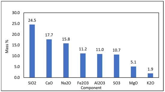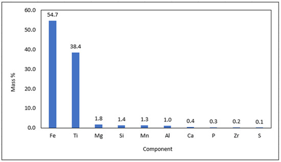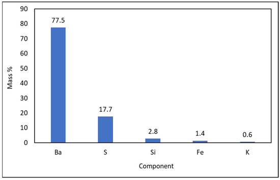 As supplied by Newpark Resources, the weighting agent barite is of an acceptable oil and gas standard. The results of the X-ray fluorescence (XRF) analysis of the elemental composition of barite, as displayed in Figure 1, usually have barium (Ba) present at 77.5 wt%, sulfur (S) at 17.7 wt%, and a minor trace of potassium, silicon, and iron [8]. While the obtained outcome of XRF analysis of Beulah fly ash as reported by Oni et al. [9] revealed that it is made up of silicon oxide (SiO2) at 24.5%, calcium oxide (CaO) at 17.7 wt%, sodium oxide (Na2O) at 15.8 wt%, iron (III) oxide (Fe2O3) present at 11.2 wt%, aluminum oxide (Al2O3) at 10.9 wt%, sulfur trioxide (SO3) at 10.7 wt%, magnesium oxide (MgO) present at 5.1 wt%, and potassium oxide (K2O) at 1.9 wt% as shown by Figure 2. The elemental composition of ilmenite was measured utilizing the RIGAKU Benchtop Spectrometer and was found to contain 54.7% iron (Fe), 38.4% titanium (Ti), 1.8% magnesium (Mg), 1.4% silicon (Si), 1.3% manganese (Mn), 1.0% aluminum (Al), 0.4% calcium (Ca), 0.3% phosphorus (P), 0.2% zirconium (Zr), 0.1% sulfur (S), 0.1% niobium (Nb), 0.08% potassium (K), 0.07% zinc (Zn), 0.04% copper (Cu), 0.03% nickel (Ni), and 0.01% chlorine (Cl), as presented in Figure 3.